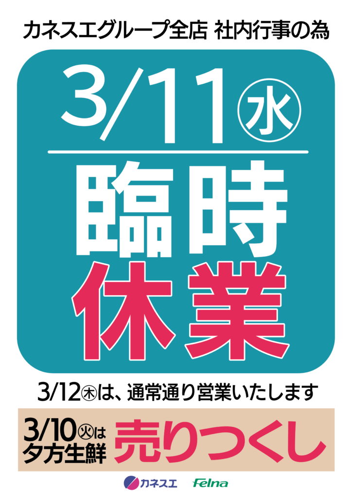 平素よりカネスエグループをご利用いただき、誠にありがとうございます。この度、社内行事のため、3月11日(水)は臨時休業とさせていただき、3月12日(木)より、通常営業いたします。