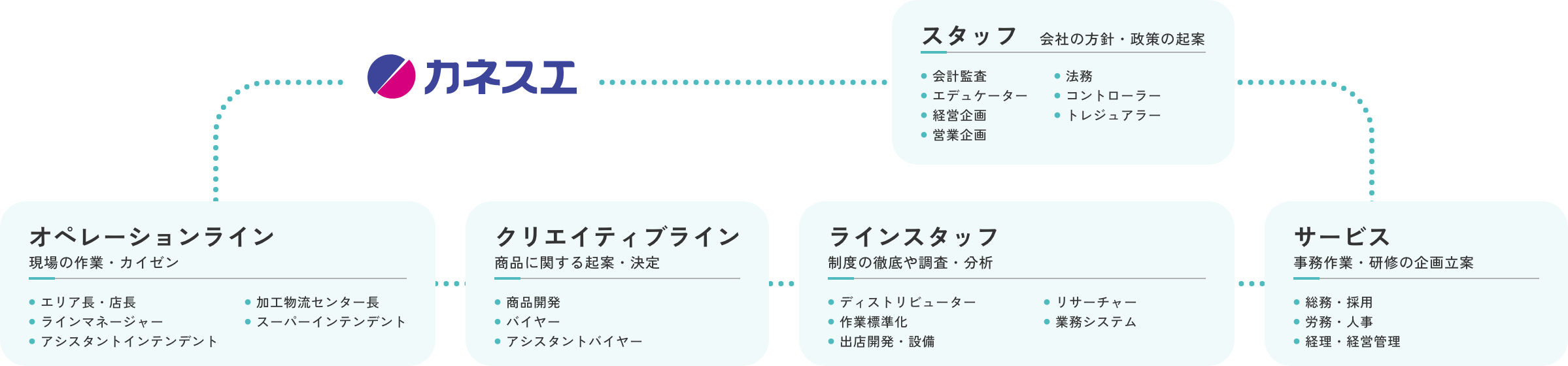 カネスエでは、入社後1〜3年目のOJTを通じて基礎を習得し、店舗やセンター業務を経験。4〜9年目にはリーダー・センター責任者などへのキャリアアップを図り、10年目以降にはマネージャーやバイヤー、経営幹部候補としての活躍が期待されます。多彩なセクションへのジョブローテーション制度も導入しており、自分に合った道を見つけながら成長を続けられる環境です。