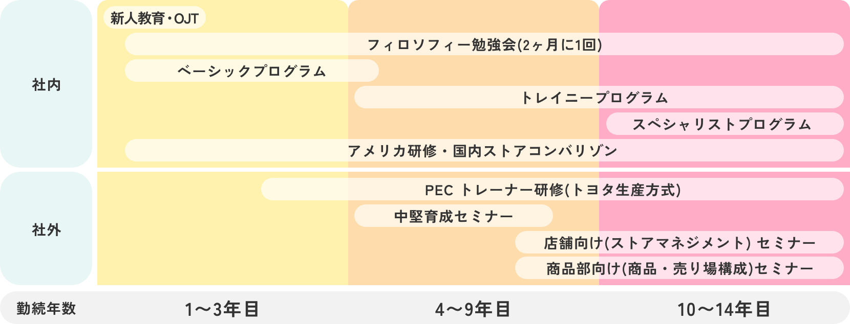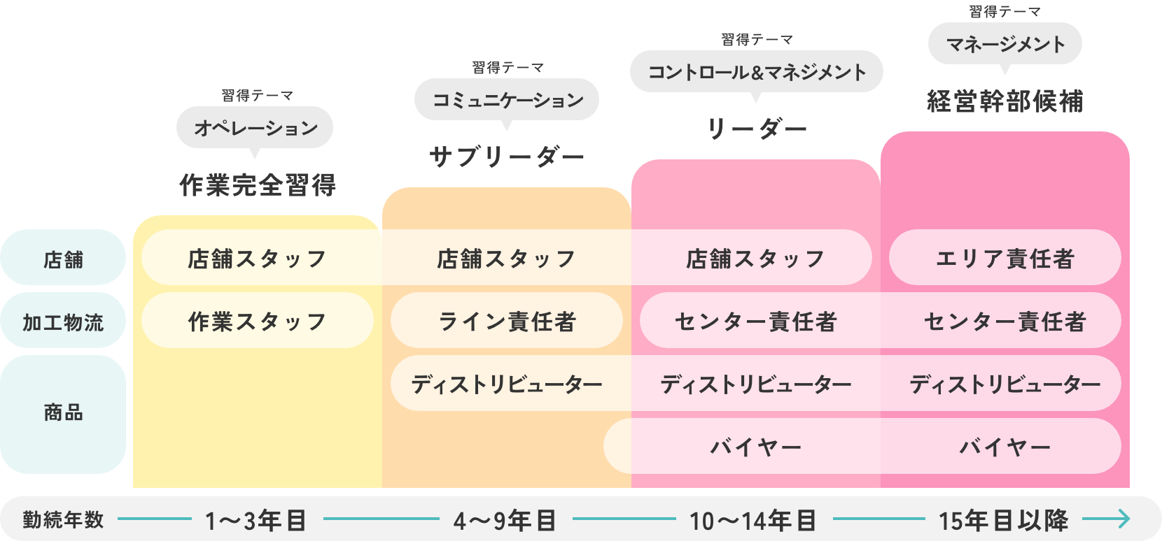 店舗、センター勤務を通して基礎を習得し、各種マネジメントを学んだ後、トレーナー、ストアマネジャー、バイヤーなど様々なセクションで活躍できる場が用意されています。
